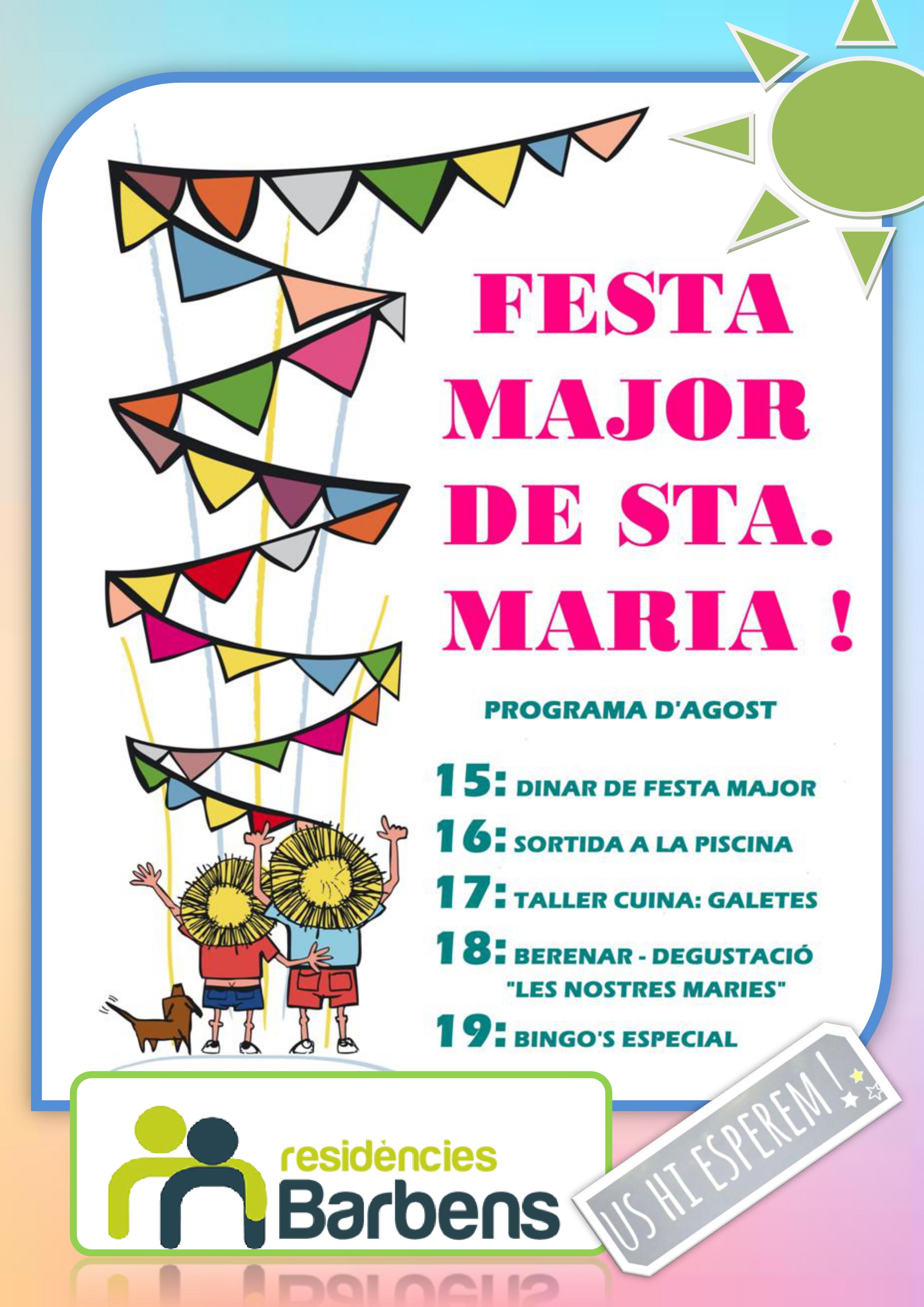 AGOSTO + BARBENS + MÚSICA + MARÍAS = ¡¡¡ FIESTA MAYOR !!! Agosto es mes de fiestas mayores y Barbens no podía ser menos … El día 15 estamos de celebración en honor a nuestras Marías, ¡ qué no son pocas ! Aquí os pasamos el programa especial de esta semana con las correspondientes actividades. ¡ Os deseamos que paséis un FELIZ DÍA DE SANTA MARÍA !