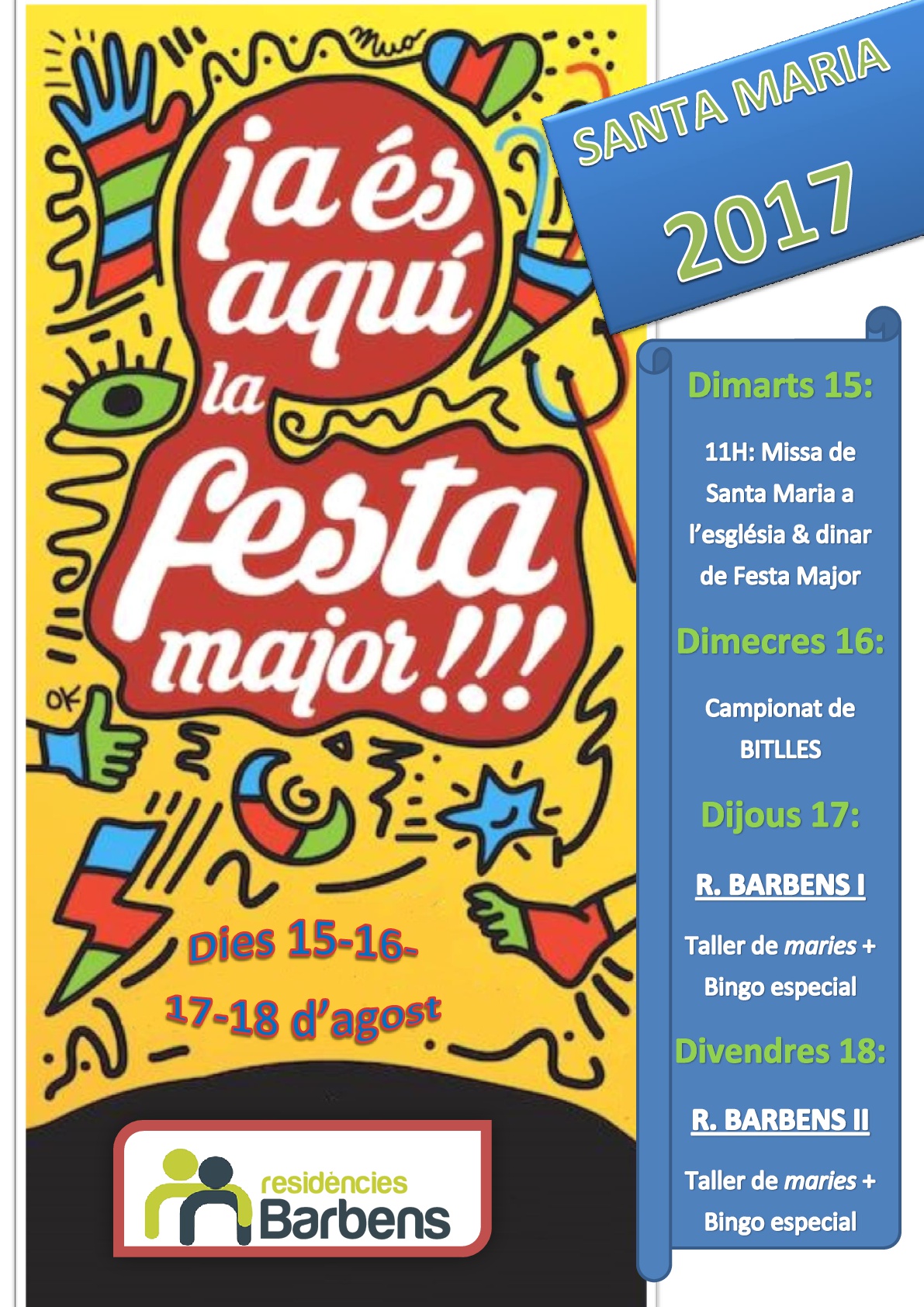 Agosto es el mes oficial de Fiesta Mayor y Barbens no podía ser menos. El día 15 estamos de celebración en honor a todas nuestras Marías, que no son pocas… ¡ nosotros las tenemos en paquetes ! A continuación os pasamos el programa especial de Santa María con las correspondientes actividades. Vecinos de Barbens os deseamos una buena FIESTA MAYOR y un feliz día del santo a todas las Marías, Marionas & Marianos !!!