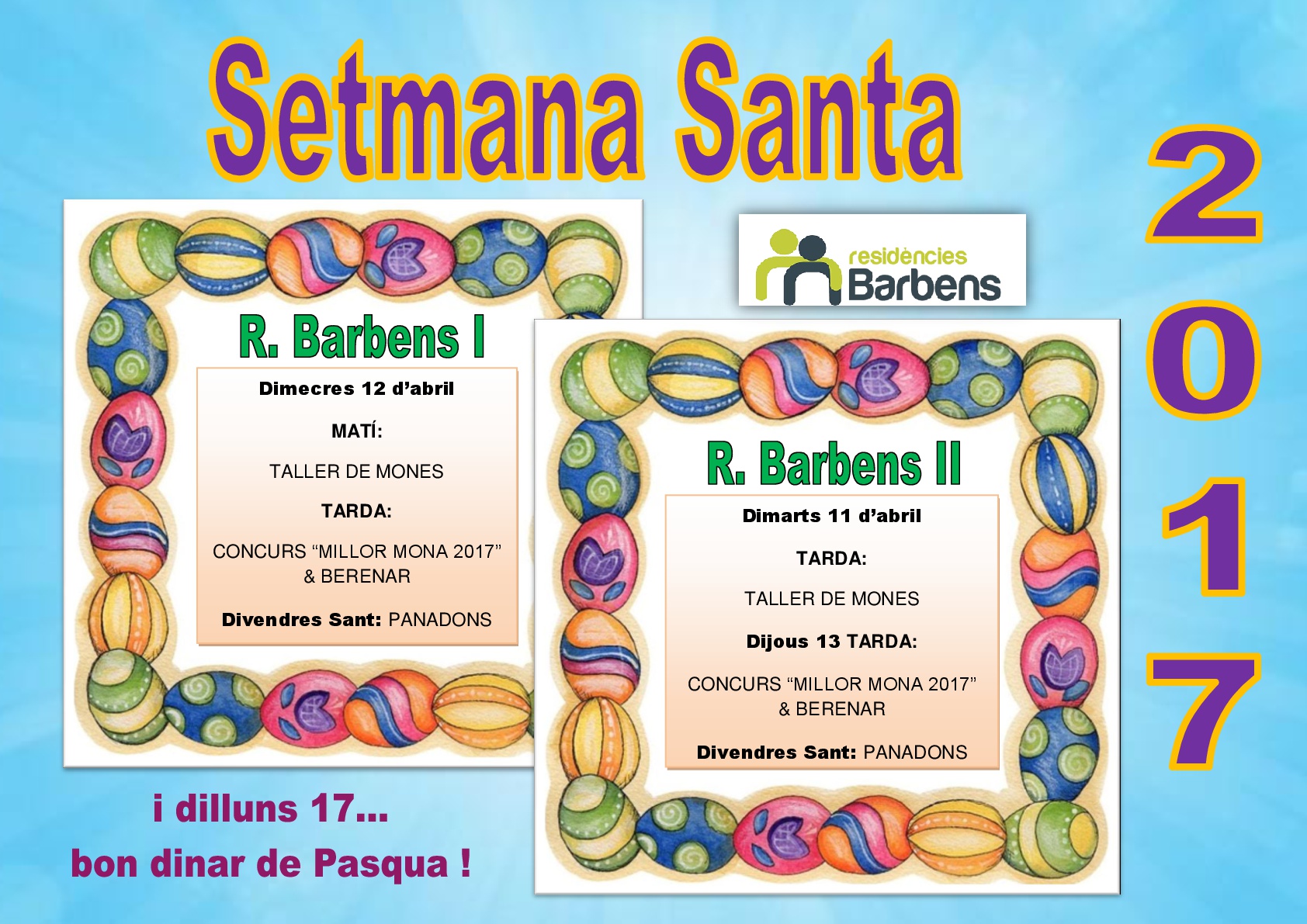 Arranca la Semana Santa 2017 llena de actividades en las residencias. Aquí os dejamos la programación para que no os perdáis ni una: talleres y concursos de monas, bingo especial, y muchas sorpresas más. ¡¡¡ Que paséis una FELIZ SEMANA SANTA !!!