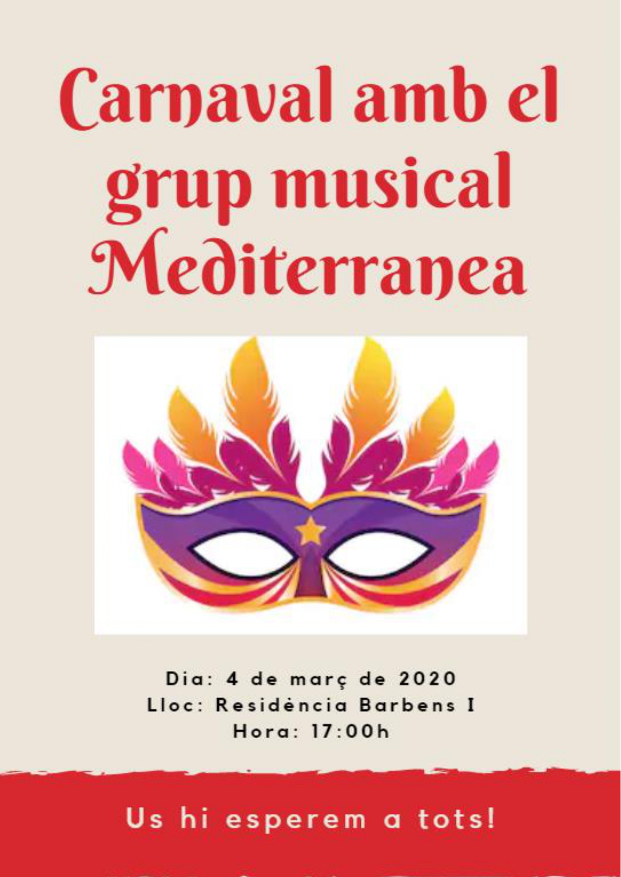 CARNAVAL DE MIEDO… Os invitamos a pasar dos tardes de terror, el 26 de febrero en la Residencia Barbens II. Y el 4 de marzo en la Residencia Barbens I amenizado con el grupo musical MEDITERRANEA. Os esperamos a partir de las 17h con mucha fiesta