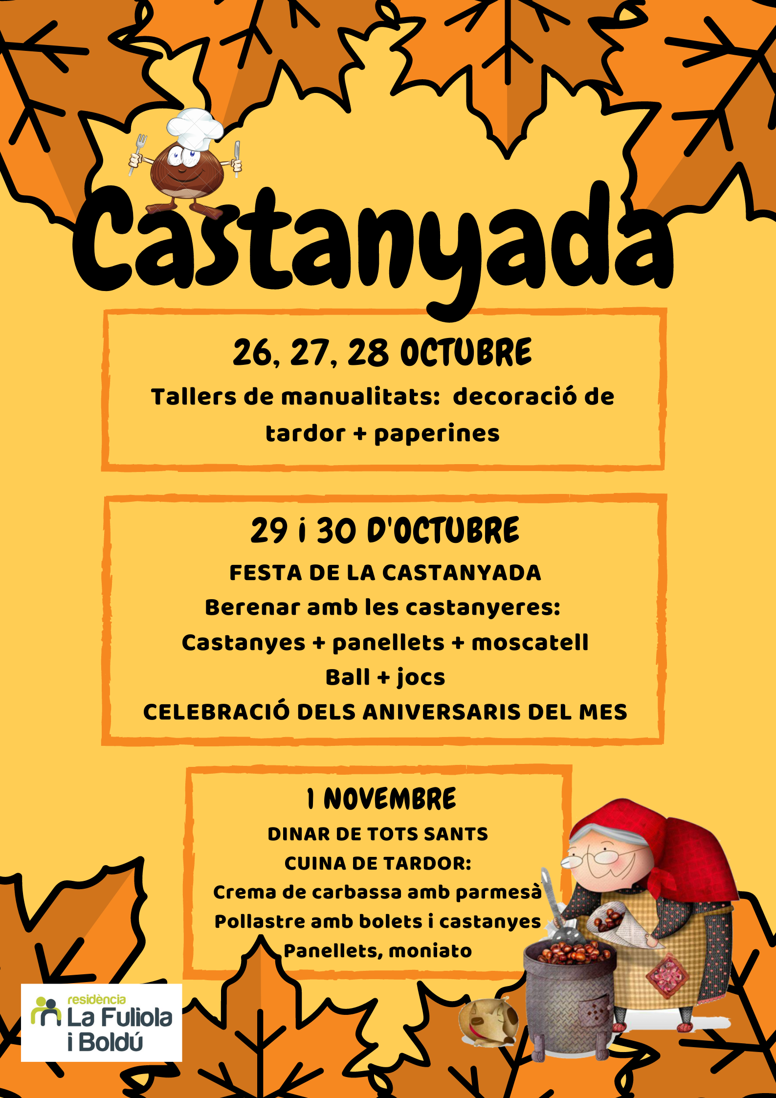 Celebraremos la fiesta de la castañada donde nos visitarán las castañeras para traernos castañas y panellets, bien regados con moscatel. Celebraremos los cumpleaños del mes y después la fiesta continuará con bailes y juegos.