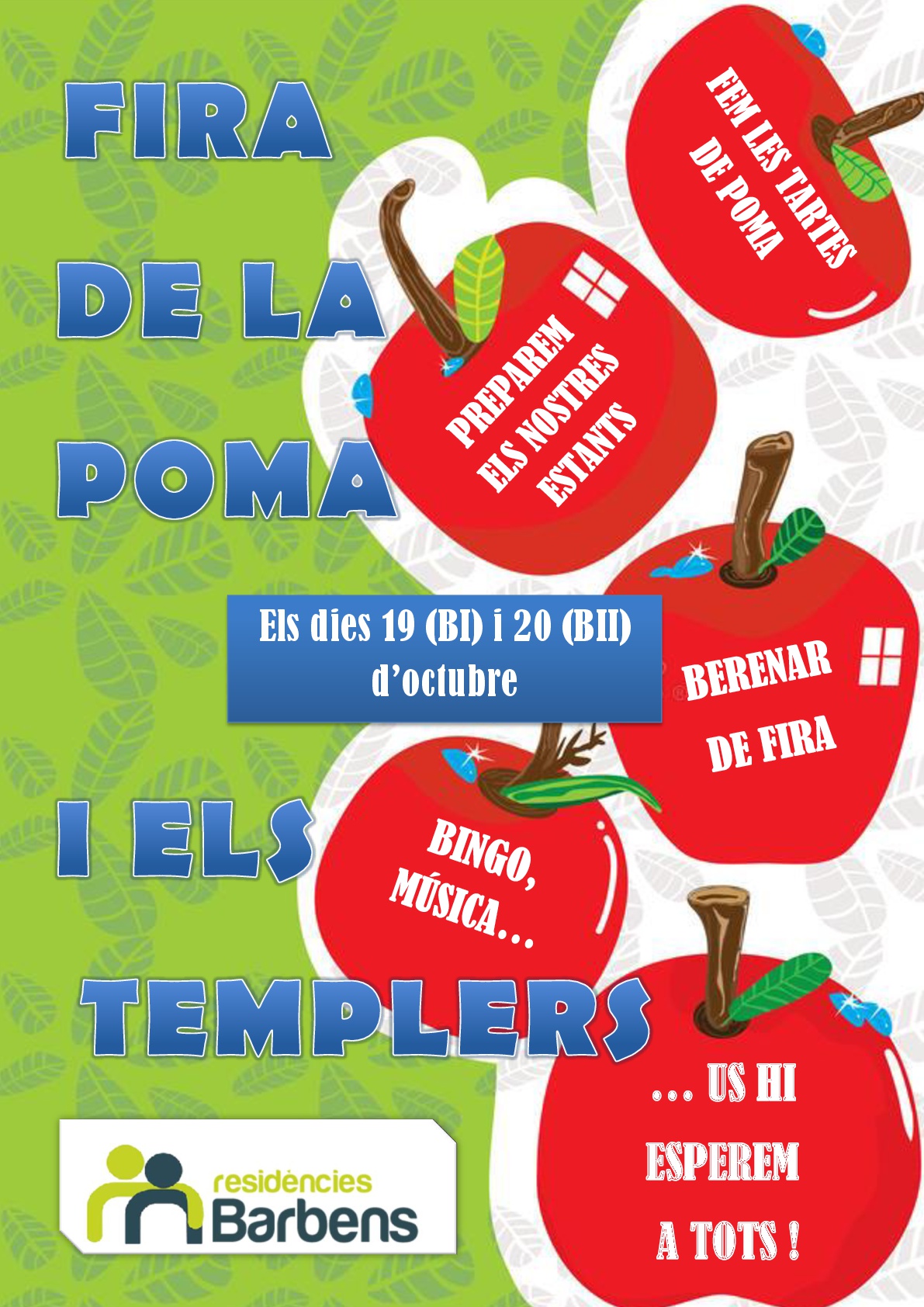Como cada año damos el pistoletazo de salida a las fiestas de otoño con LA FIRA DE LA POMA & ELS TEMPLERS. Los días 19 y 20 de octubre a las Residències Barbens pasaremos dos días repletos de actividades en torno a la temática de la manzana. El objetivo de la feria es promover la manzana local ambientando los centros con los tradicionales estantes de manzanas tipos varios “made in Barbens”. Y no pueden faltar nuestras tartas de manzana hechas por residentes, trabajadores y familiares. ¡ Para chuparse los dedos ! ¡¡¡ VIVA LA MANZANA DE BARBENS !!!