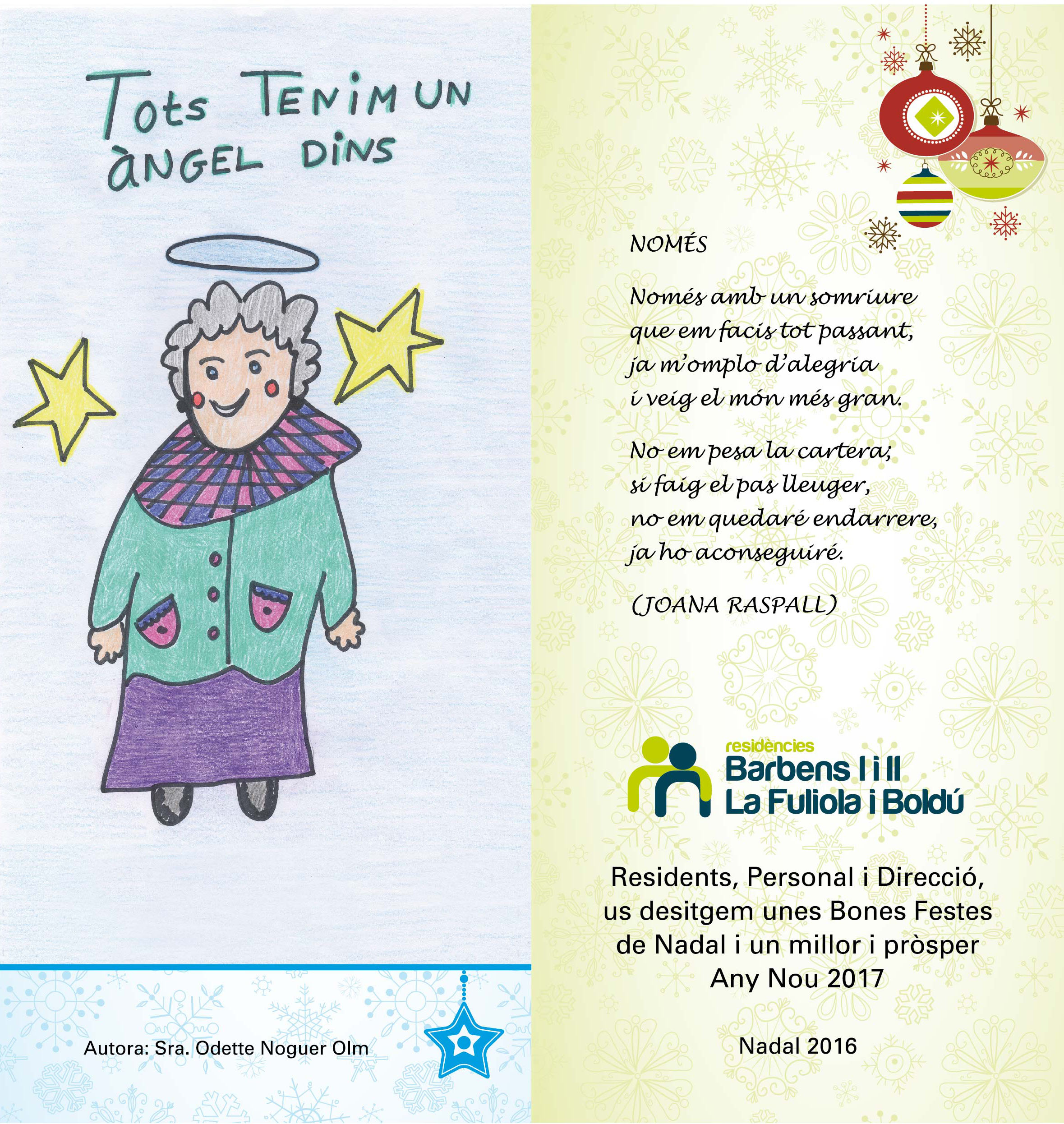 Con esta postal, Residentes, Personal y Dirección os deseamos unas Felices Fiestas de Navidad y un mejor y próspero Año Nuevo 2017. La ilustración es obra de la Sra. ODETTE NOGUER, residente ganadora del concurso de postales de Navidad, elegida por votos de familiares, trabajadores y residentes.