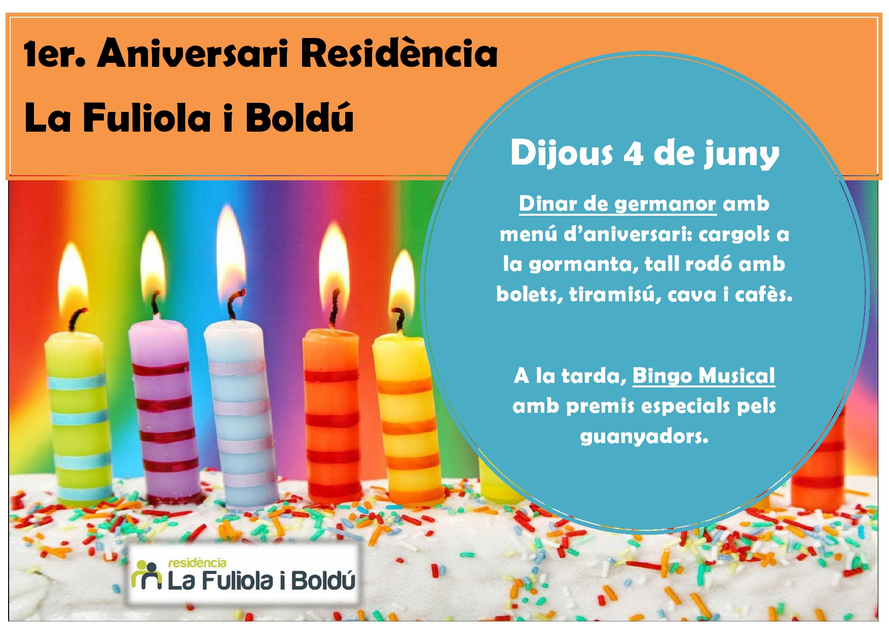 El 4 de junio celebramos el primer aniversario de la Residència la Fuliola i Boldú, y para celebrarlo con nuestros residentes, habrá un menú especial de cumpleaños para chuparse los dedos. Por la tarde habrá sesión de bingo musical. Donde se tendrá que afinar bien el oído para reconocer las diferentes canciones y conseguir los premios especiales que tenemos preparados. Feliz aniversario a todos nuestros residentes y a todo el equipo de profesionales!