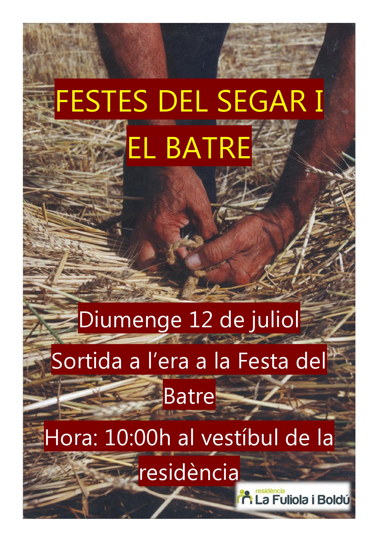 El pueblo de La Fuliola ha convertido en fiesta lo que antaño fue la dura tarea de la siega y la trilla. Este año se celebra la 36ª edición y nosotros no nos la queremos perder. A parte de decorar la residencia con elementos tipicos de la siega y la trilla, realizaremos una salida a la Festa del Batre, donde habrá puestos de artesanos, un encuetro de encajeras de bolillos, el tendido de las gavillas en la era y las tandas de girar con los animales. Os animamos a participar en la salida y a disfrutar de la fiesta!