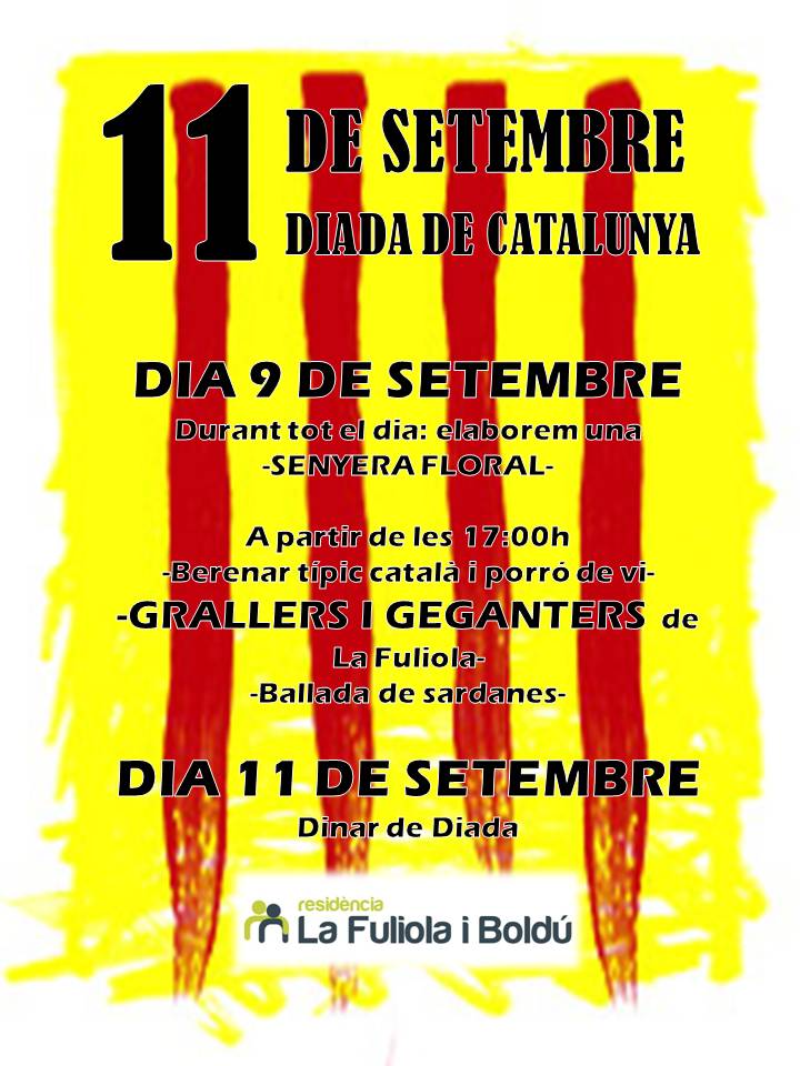 Empezamos la cuenta atrás para la DIADA y presentamos los actos que tenemos preparados. El viernes 9 durante todo el día se elaborará una SENYERA FLORAL: todo el mundo que venga podrá colaborar y colgar su flor. Por la tarde tendremos una merienda típica catalana y porrón de vino, con la compañía especial de la COLLA DE GRALLERS Y GEGANTERS de La Fuliola. Para finalizar la fiesta se bailarán sardanas entre todos los asistentes. El domingo 11-S nos lameremos los dedos con el menú especial de Diada. ¡Que tengáis una buena DIADA DE CATALUNYA 2016!