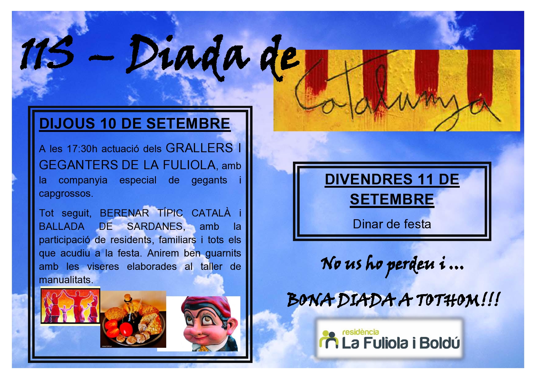 Empieza la cuenta atrás para la Diada y aquí tenéis el programa con los actos que hemos preparado para conmemorarla. El jueves 10 de setiembre contaremos como invitados especiales con los Grallers i Geganters de La Fuliola i Boldú, donde veremos danzar los gegants y capgrossos del pueblo acompañados con el ritmo de las grallas. Acto seguido, cogeremos fuerzas con una merienda típica catalana para continuar con una “ballada de sardanes popular”, donde participaran residentes, trabajadores, familiares, amigos, vecinos,… y todos los que vengáis a la fiesta; si no sabéis no hay problema, entre todos aprenderemos los pasos más típicos. Os esperamos a todos y que tengáis una feliz Diada!