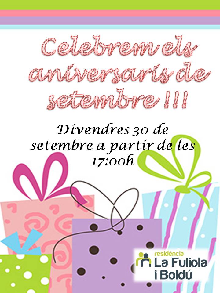 Estáis todos invitados a la FIESTA DE CUMPLEAÑOS de los residentes nacidos en septiembre! Mañana viernes, por la mañana, prepararemos unos pasteles que os chuparéis los dedos; y por la tarde a partir de las 17.00 tendrá lugar la fiesta, donde no faltará el piscolabis, las velas, el baile, la alegría y la diversión. Ya lo sabéis … el viernes tenéis una cita con nosotros. ¡FELICIDADES A TODOS LOS RESIDENTES NACIDOS EN SEPTIEMBRE !!