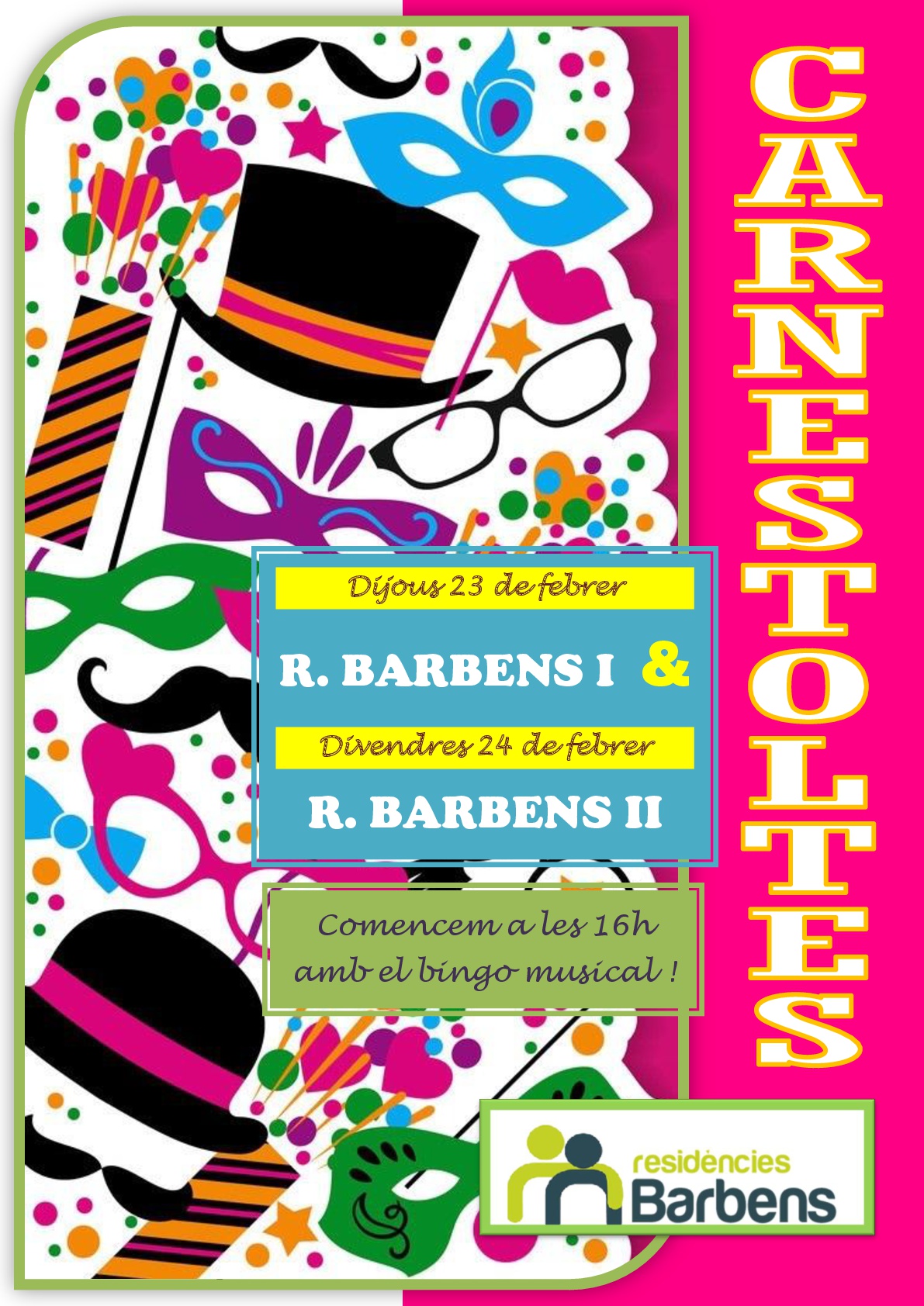EXCLUSIVA, EXCLUSIVA… Los días 23 y 24 de febrero a partir de las 16H podremos disfrutar en riguroso directo del grupo senior más cotizado del momento: “THE BUHOS of BARBENS I & II”. Que no duermen ni de noche ni de día para tener los disfraces a punto !!! Os esperamos a todos para pasar dos tardes divertidas y entretenidas con el bingo musical donde podremos participar juntos con las mejores canciones de nuestros abuelos, merienda y mucha, mucha diversión. ¡ Qué Carnaval hemos preparado … “con más pluma” !