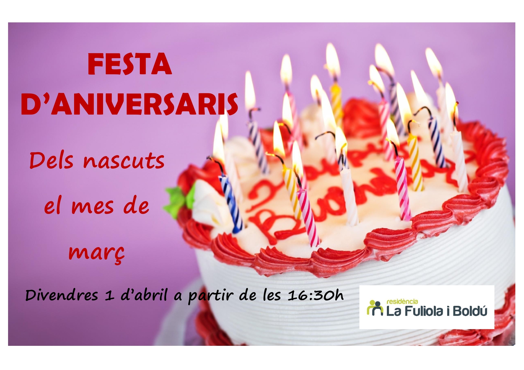 Felicitamos a todos los residentes nacidos en el mes de marzo! Este viernes celebraremos sus CUMPLEAÑOS, soplaremos las velas con una buena merienda y, a continuación, habrá baile para hacerla bajar. La fiesta empieza a partir de las 16.30, ESTÁIS TODOS INVITADOS!
