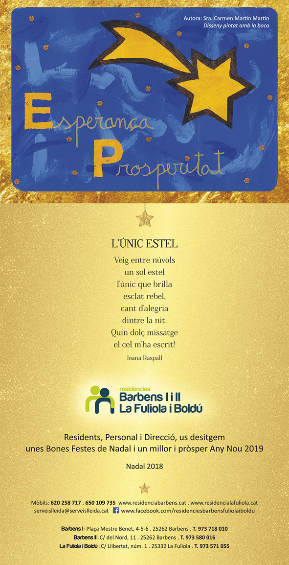 De parte de la dirección, personal y residentes esperamos que recibáis nuestros mejores deseos para estas fiestas de Navidad y para el año que pronto estrenamos. ¡ SALUD & FELIZ NAVIDAD !