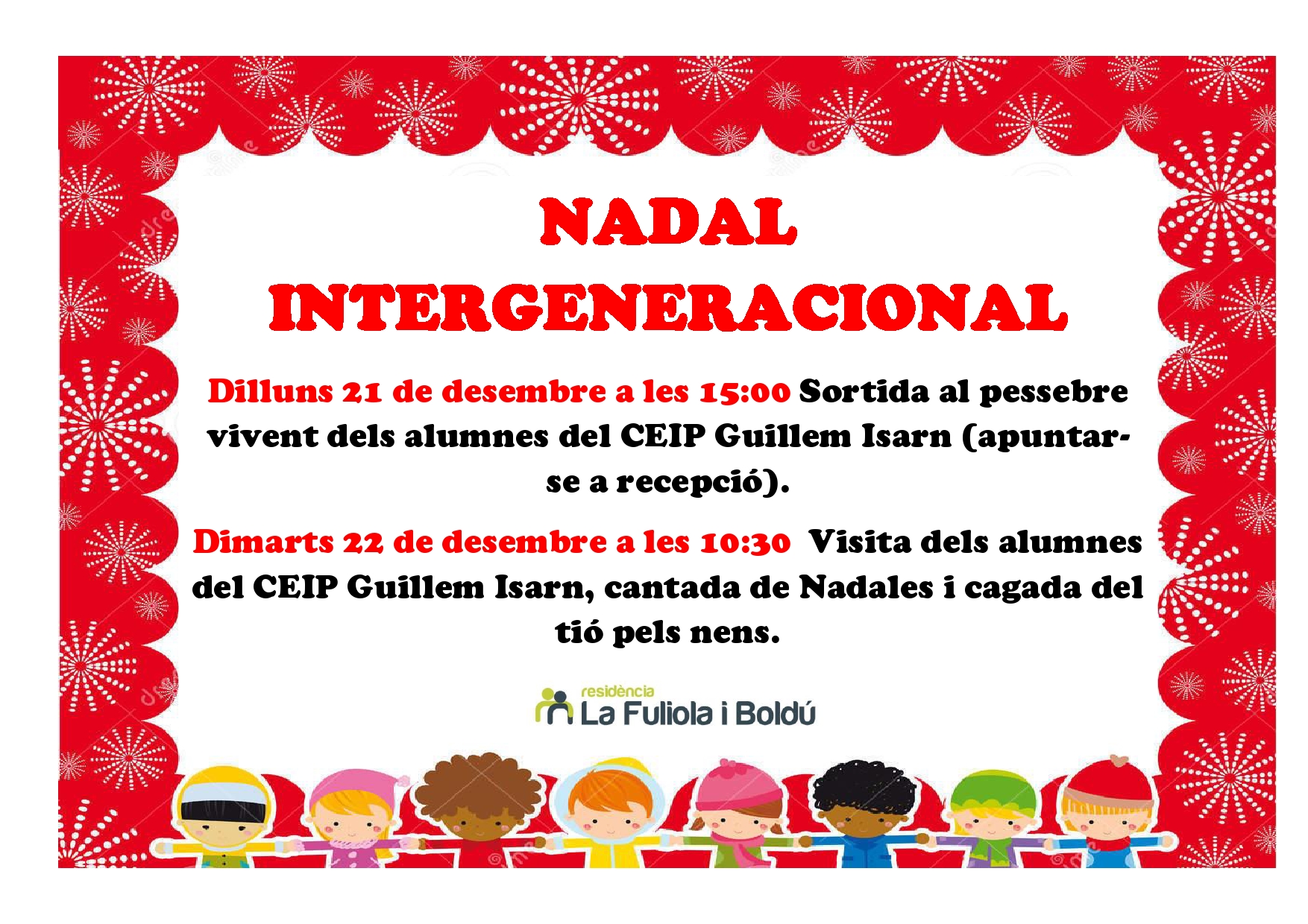 Llega la NAVIDAD INTERGENERACIONAL con los alumnos del CEIP Guillem Isarn. El próximo lunes iremos a ver el pesebre viviente de la escuela y el martes serán los niños los que vendrán a la residencia a cantar villancicos y cagar el tió. ¡Dejad que la ilusión de la Navidad os invada como cuando erais niños!