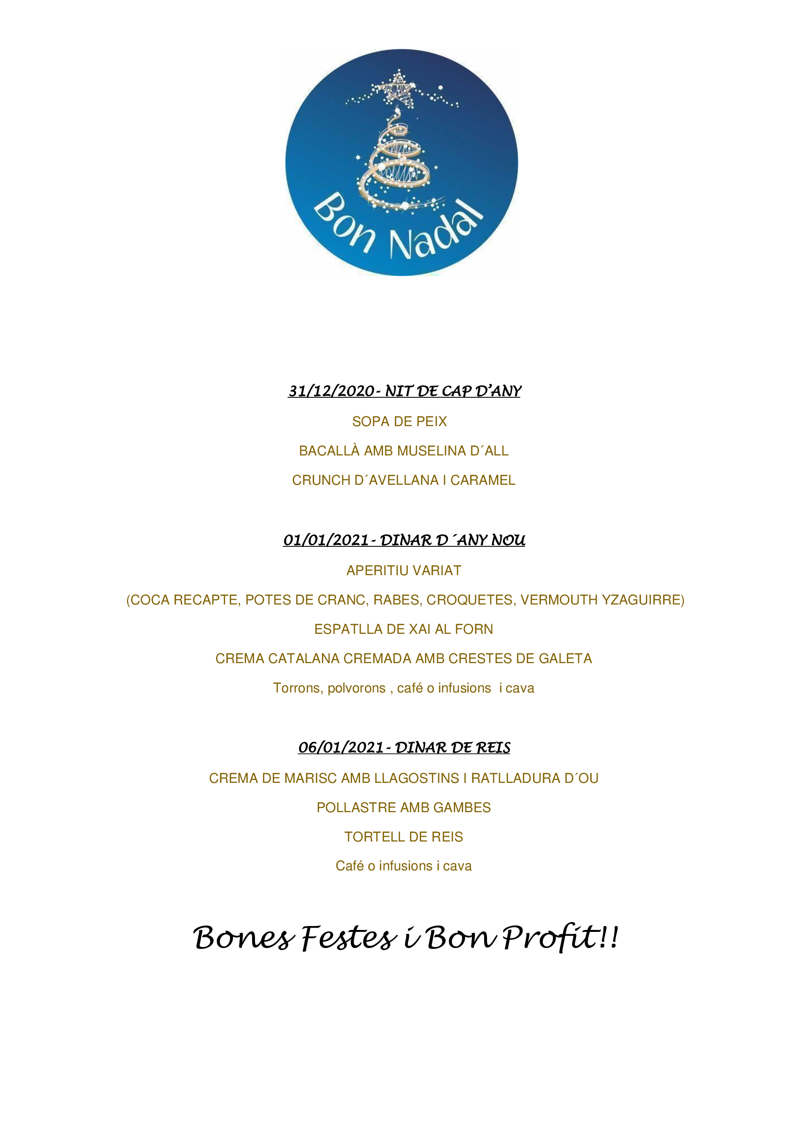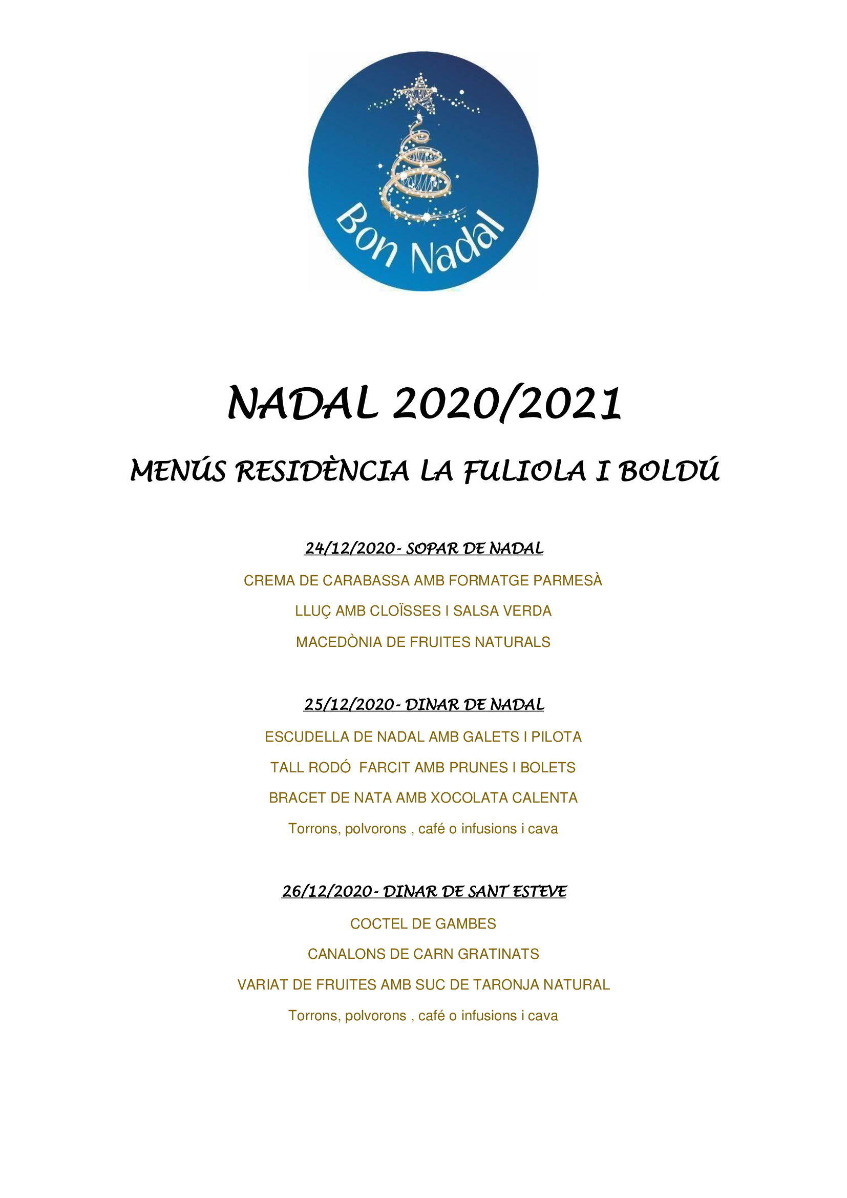 MENÚ DE FIESTAS Posted on desembre 24th, 2020 by Residència Barbens No perdamos las buenas costumbres. ¡Buen provecho!