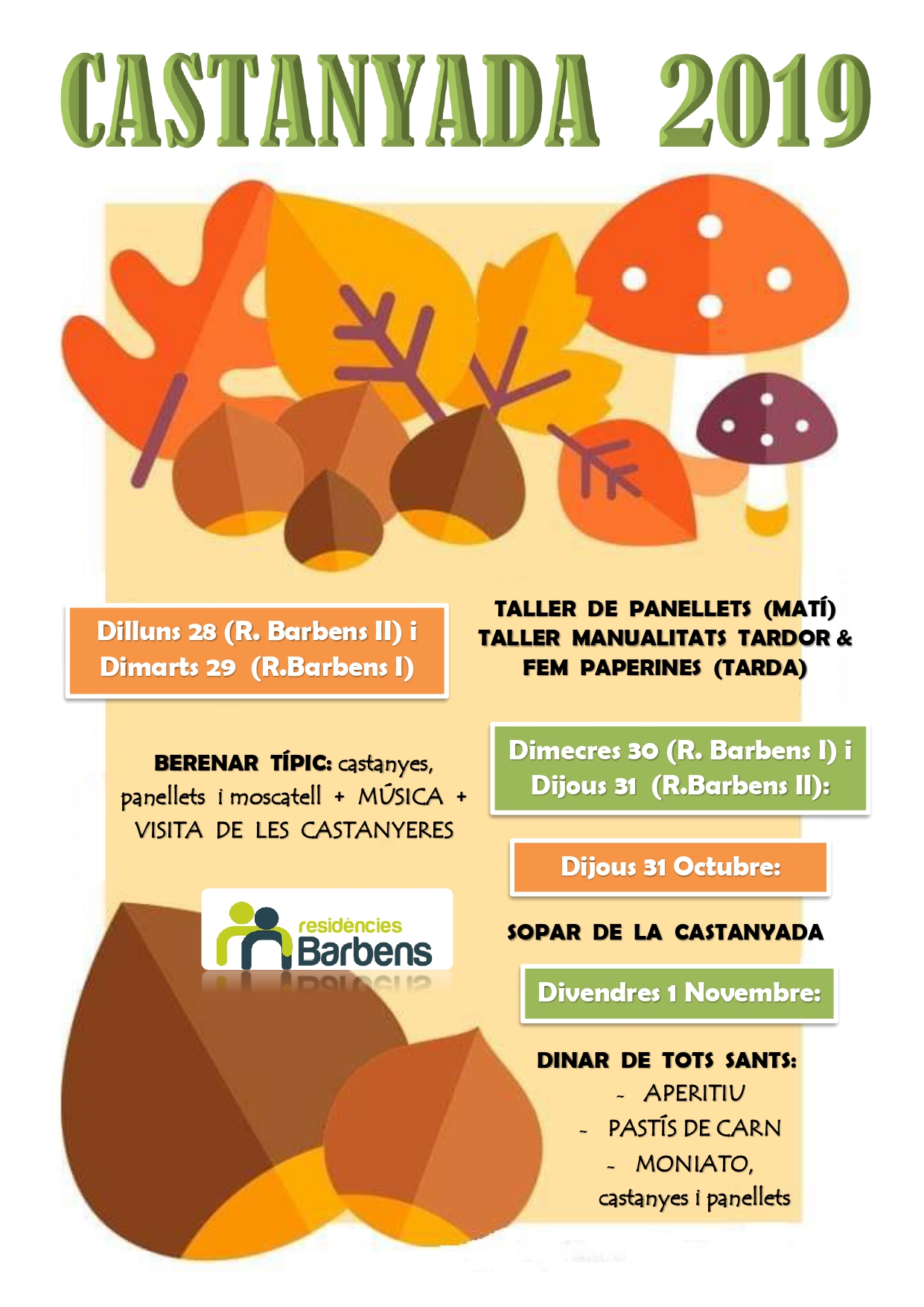 Nos ponemos “manos en la masa” para hacer los panellets y tener a punto todos los preparativos de la CASTAÑADA ❗️❗️ A continuación, os adjuntamos el programa con las actividades que se realizarán en las Residències Barbens: taller de panellets, taller de paperinas y decoración del otoño. Y la fiesta de la castañada donde nos visitarán unos castañeros de lujo este año. ¡ No os paséis con el azúcar y buena castañada !