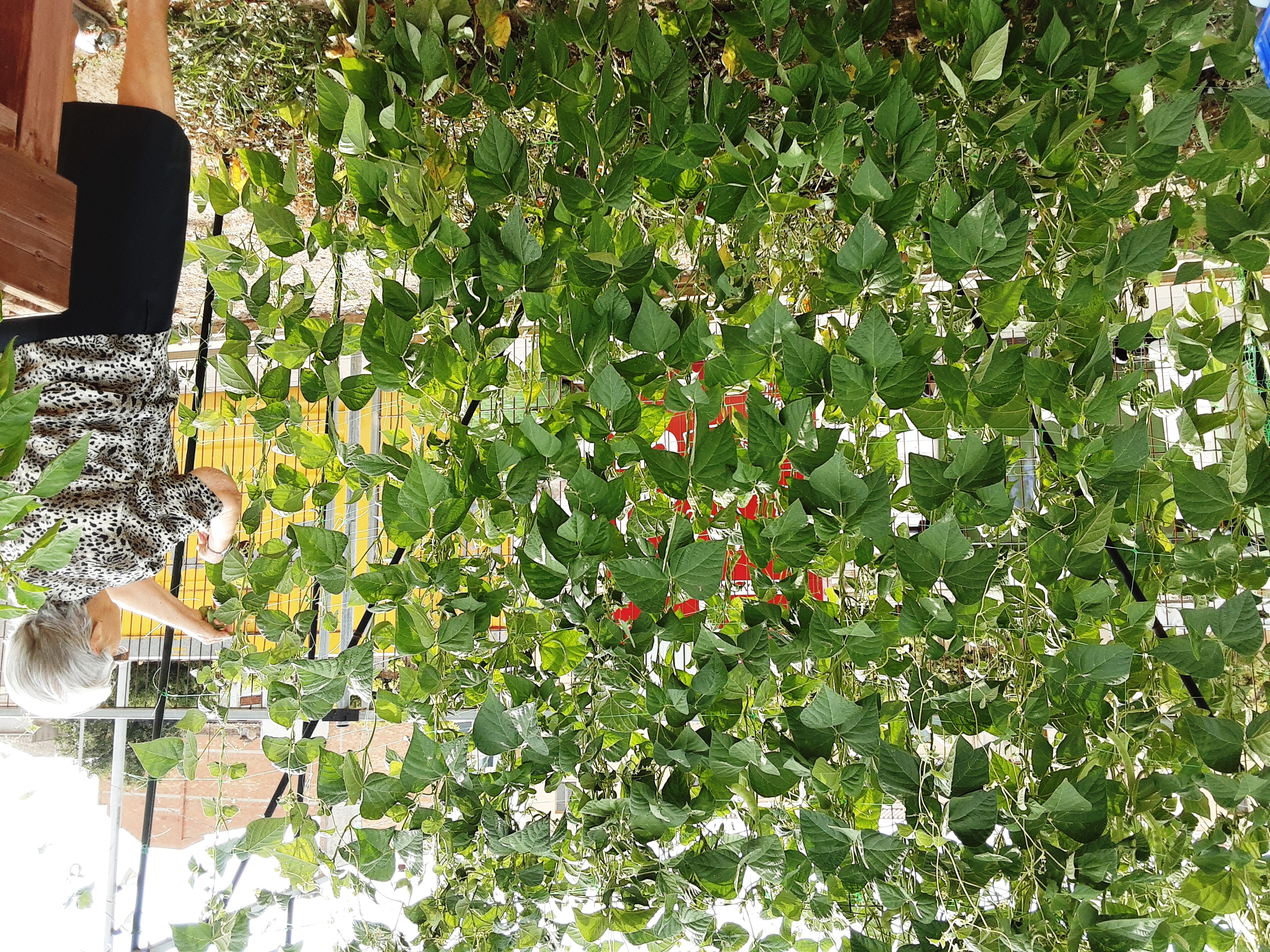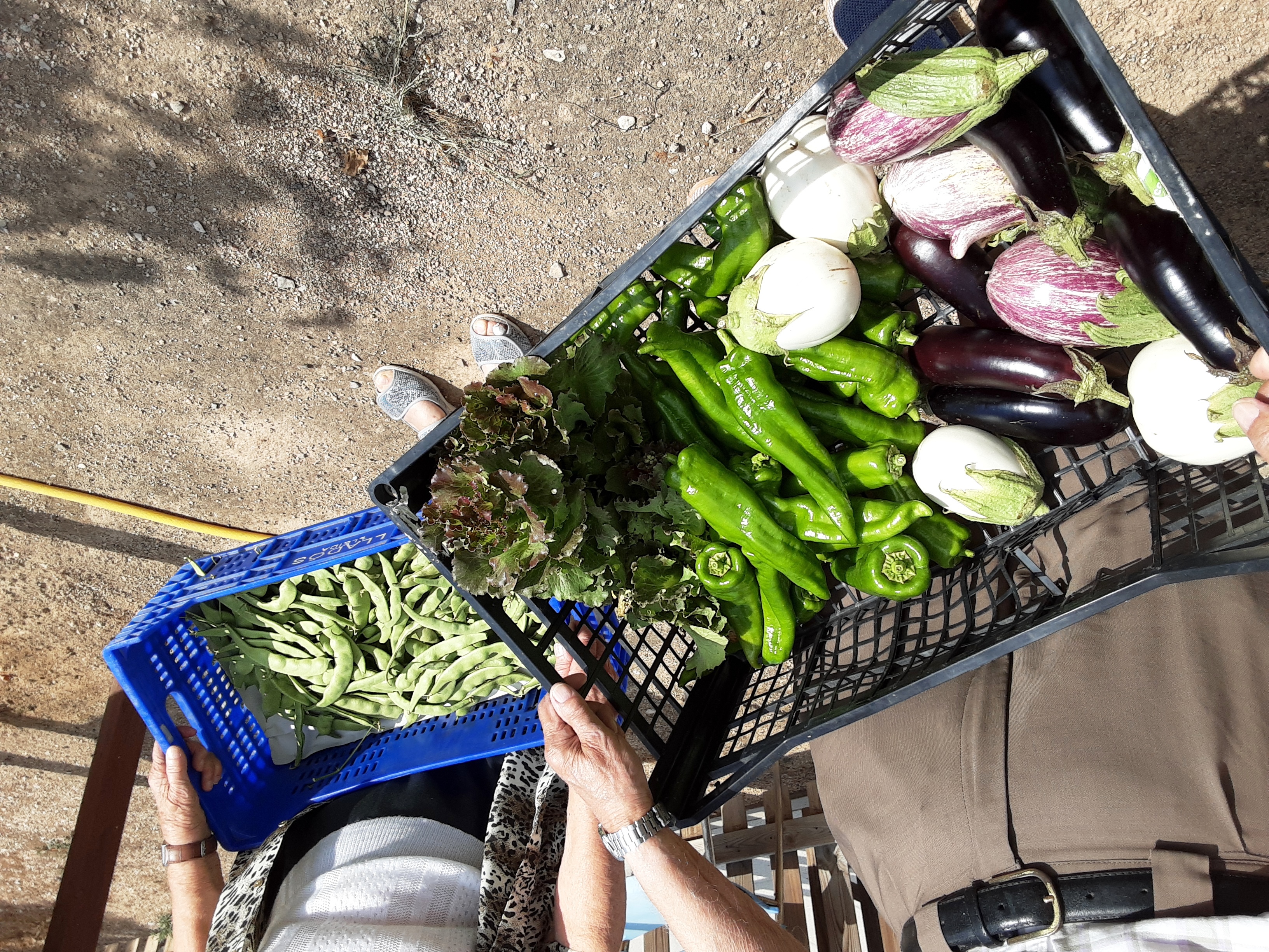 <<A mí me gusta ir al huerto a cosechar: pimientos, berenjenas, judías. Siempre habíamos hecho huerto a casa y ahora lo continúo haciendo aquí. Lo bueno que tiene este huerto es que no nos tenemos que agachar para trabajarlo. Hoy mismo hemos cosechado un montón de pimientos>> M.A