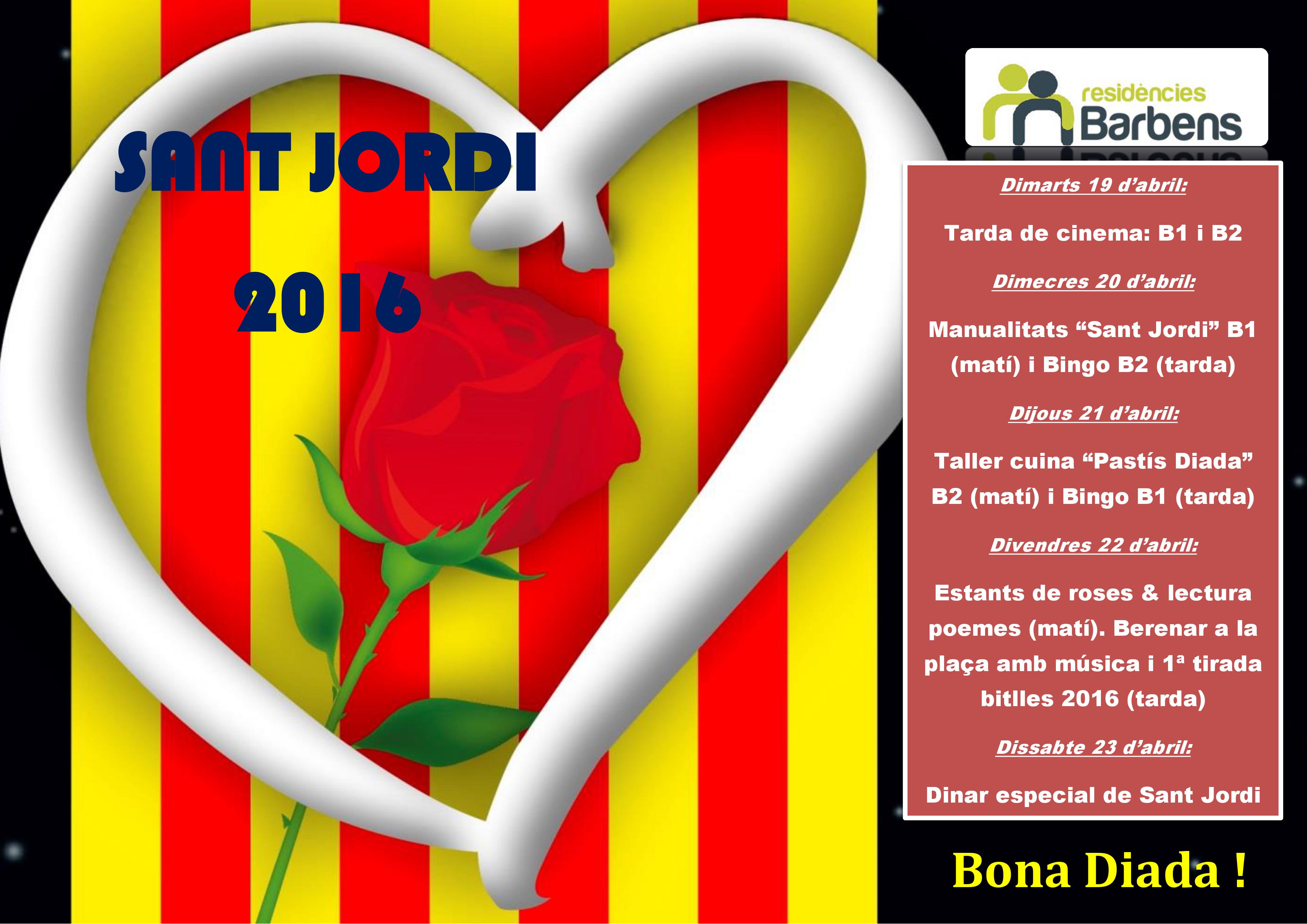Para esta semana de SANT JORDI tenemos un programa especial de actividades que finalizará el mismo 23 de abril. El viernes día 22 nos adelantamos a la diada con la exposición de nuestros ESTANTES DE ROSAS que hemos elaborado en los talleres de manualidades. Y si el buen tiempo nos acompaña por la tarde queremos inaugurar la TEMPORADA DE BOLOS 2016 en la Plaça Mestre Benet con merienda, buena música y la mejor compañía. Os esperamos a todos !