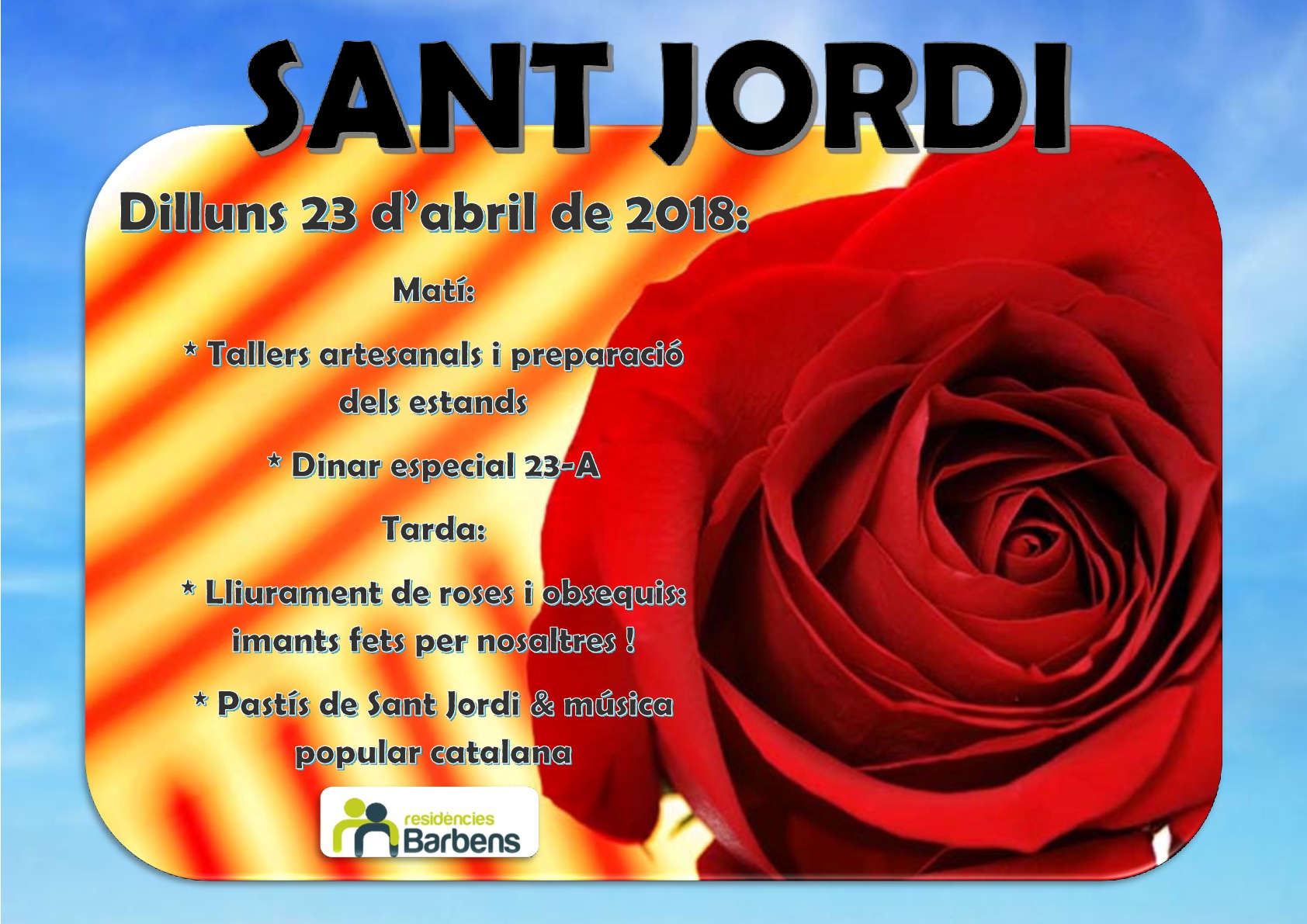 Por fin ha llegado el buen tiempo y ya tenemos las pilas bien cargadas para preparar la DIADA DE SANT JORDI 2018. A continación os adjuntamos el programa previsto para ese día con todas las actividades a realizar en las Residències Barbens. Esperamos que os apetezca acompañarnos un año más !