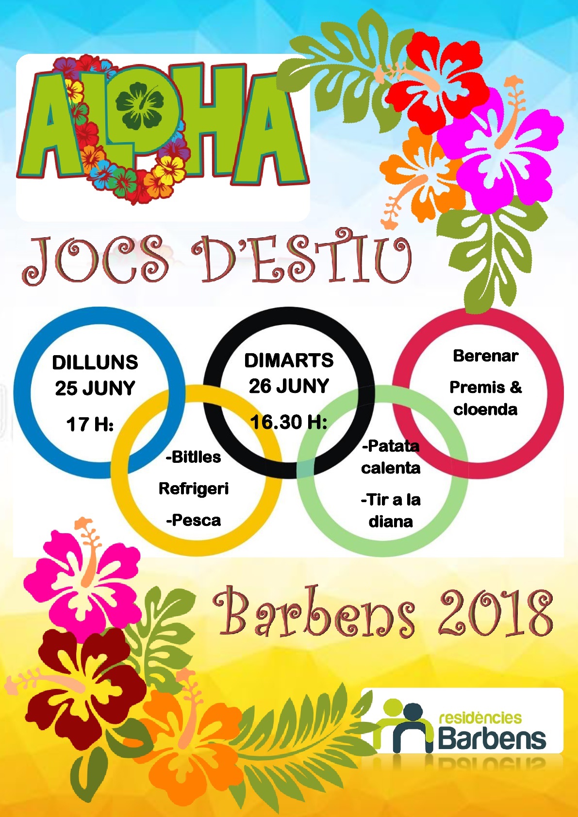 Por fin parece que damos el pistoletazo de salida al verano… ☀️️ Con el verano llega SAN JUAN y este fin de semana estamos de VERBENA. ¿ Y qué mejor para pasar la resaca de la verbena y “quemar” la coca de San Juan ??? Pues el evento más esperado del año en las Residències Barbens: LOS JUEGOS DE VERANO, edición hawaiana, los días 25 y 26 de junio a partir de las 17h de la tarde en la Plaça Mestre Benet acompañado de un buen refrigerio y la música más TOP. ¡ Ya veis que nuestro verano comienza con fuerza !