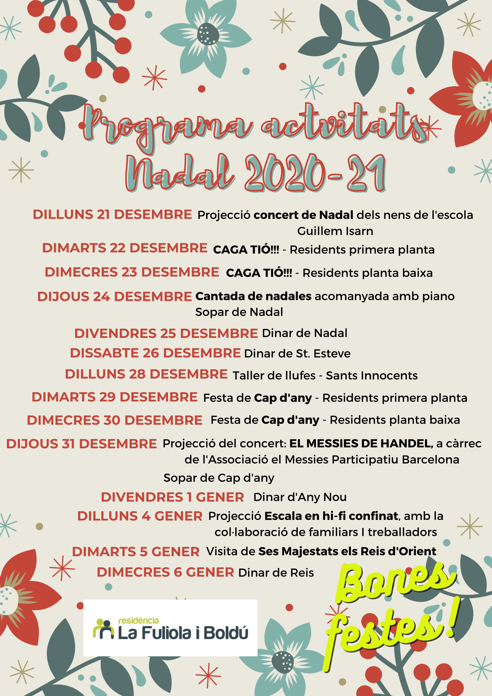 Este año no serán unas fechas fáciles para nadie, pero no tenemos que perder la esperanza y la ilusión que nos aporta la Navidad. Aquí tenéis nuestro programa de actividades para estas fiestas. Y aunque sea a distancia, os sentimos muy cerca gracias a todos los mensajes y muestras de apoyo que nos hacéis llegar.