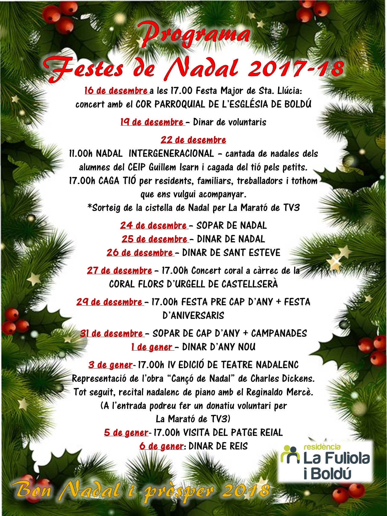 En nombre de los residentes, personal y la dirección de la Residencia La Fuliola y Boldú, os deseamos que disfrutéis de unas fiestas de Navidad entrañables y un año nuevo lleno de salud, paz, gozo y prosperidad para todos.