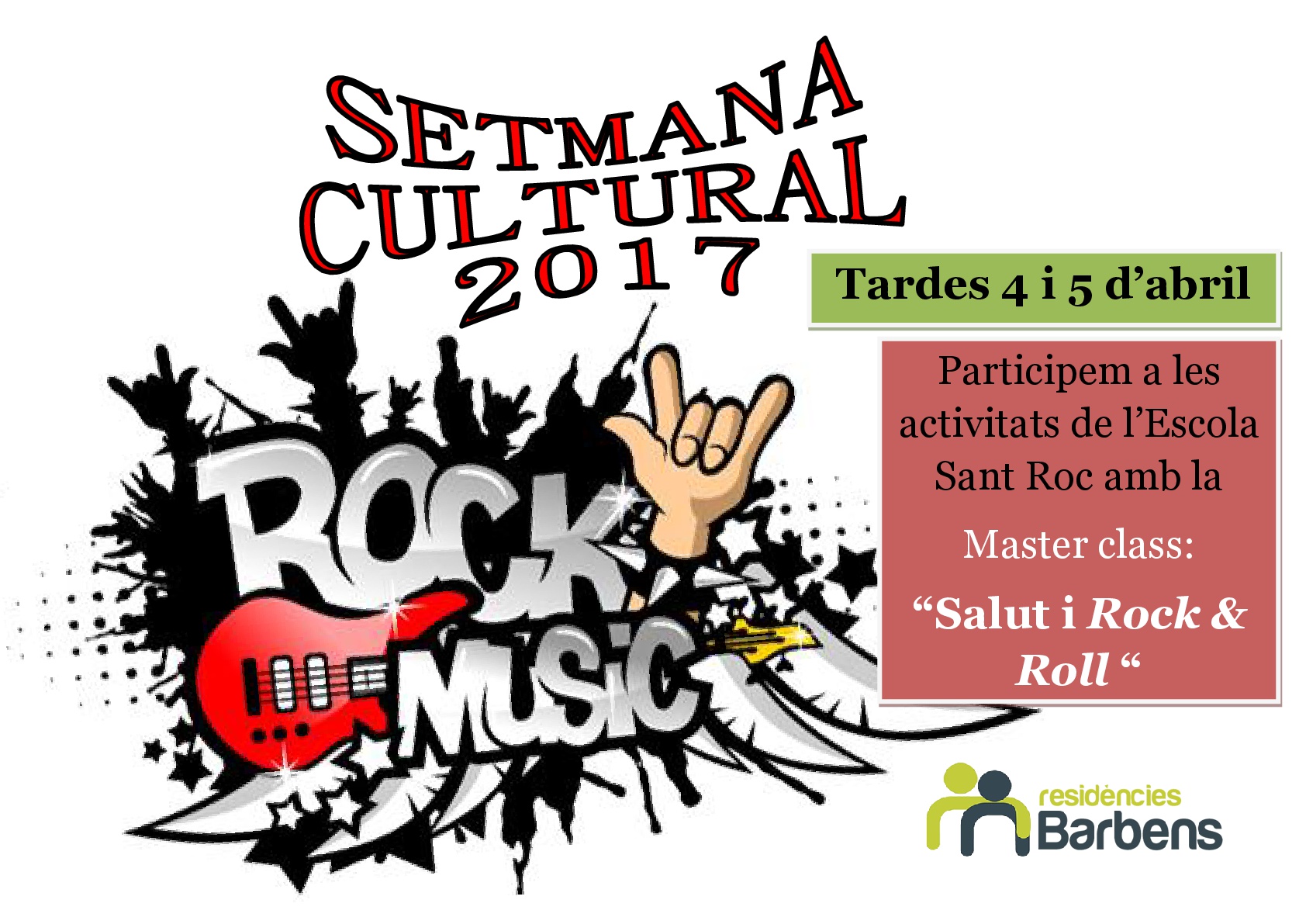 SEMANA CULTURAL 2017: Días 4 y 5 de abril de 15:30 a 17h. Desde las Residències Barbens nos unimos a la dinámica de las actividades de la Escola Sant Roc de Barbens participando con diferentes talleres de manualidades, juegos y música. ¡¡¡ SALUD y ROCK & ROLL !!!