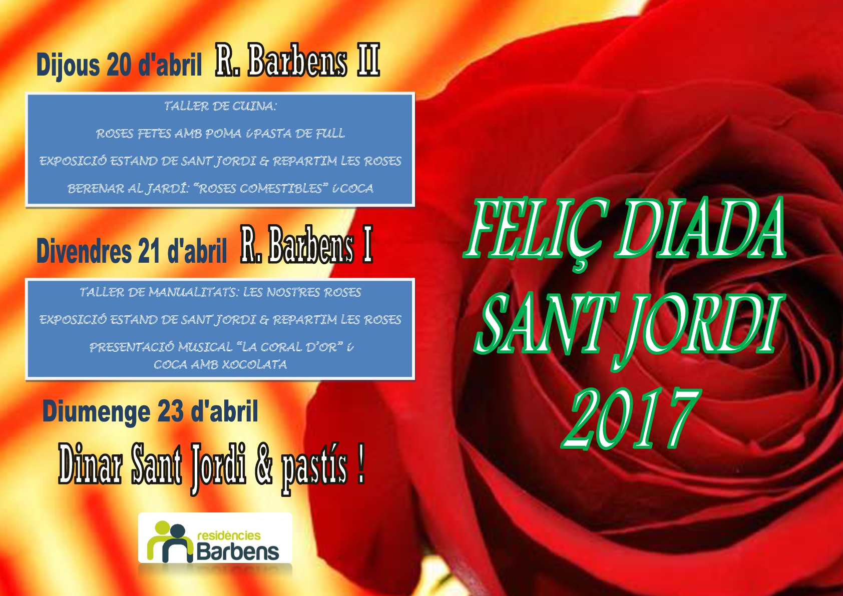 Tras la resaca de Pascua ya estamos preparados para celebrar la DIADA DE SANT JORDI !!! A continación os adjuntamos el programa previsto para estos días con todas las actividades a realizar en las Residències Barbens. Hemos organizado talleres artesanales de rosas, un taller de cocina de “rosas comestibles”, montaremos los tradicionales estantes de rosas y cantaremos mucho con la “Coral d’Or” formada por nuestros abuelos en honor a Sant Jordi. Esperamos que os apetezca acompañarnos en estos días de festividad !