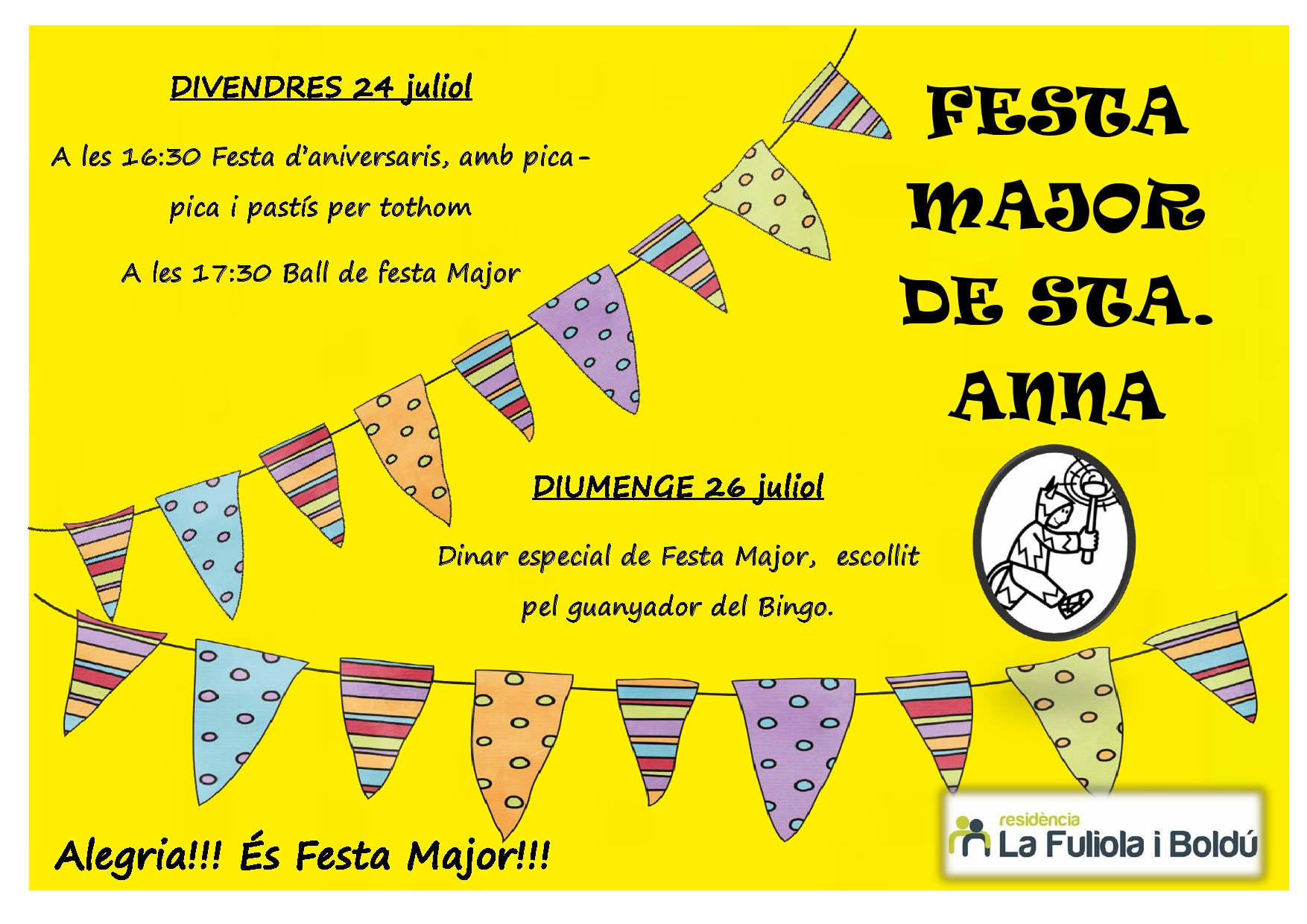 Un año más volvemos a estar de Fiesta Mayor! En la Residència La Fuliola i Boldú tenemos muchas ganas de celebrarla, este año conjuntamente con la fiesta de cumpleaños del mes de julio. El viernes 24 nos espera un buen pica-pica y pastel de cumpleaños, y para bajarlo después tendremos sesión de baile. Para el domingo 26, dia de Sta. Ana, nos chuparemos los dedos con la comida especial de fiesta, elegida por el residente ganador del último bingo. No faltéis y… alegría, es Fiesta Mayor!