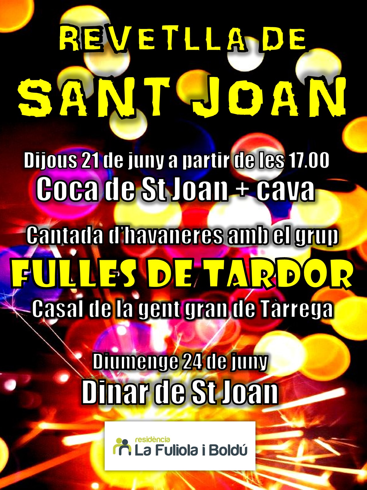 El jueves 21 nos adelantamos a la verbena de San Juan con una merienda y la celebración de los cumpleaños de junio, con coca de San Juan y cava para todos. A continuación, tendrá lugar una cantada de habaneras a cargo del grupo FULLES DE TARDOR del Casal de la Gent Gran de Tàrrega.