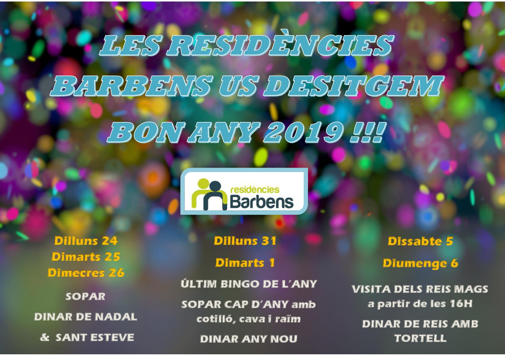 Ya ha llegado la Navidad y nos encantaría compartir con vosotros estos días tan especiales. Por eso os presentamos el programa de actividades que tenemos preparado para estas fiestas en las Residències Barbens. Os deseamos que paséis una Navidad repleta de alegría, ilusión y felicidad.✨ ¡ Feliz Navidad y próspero año 2019 !