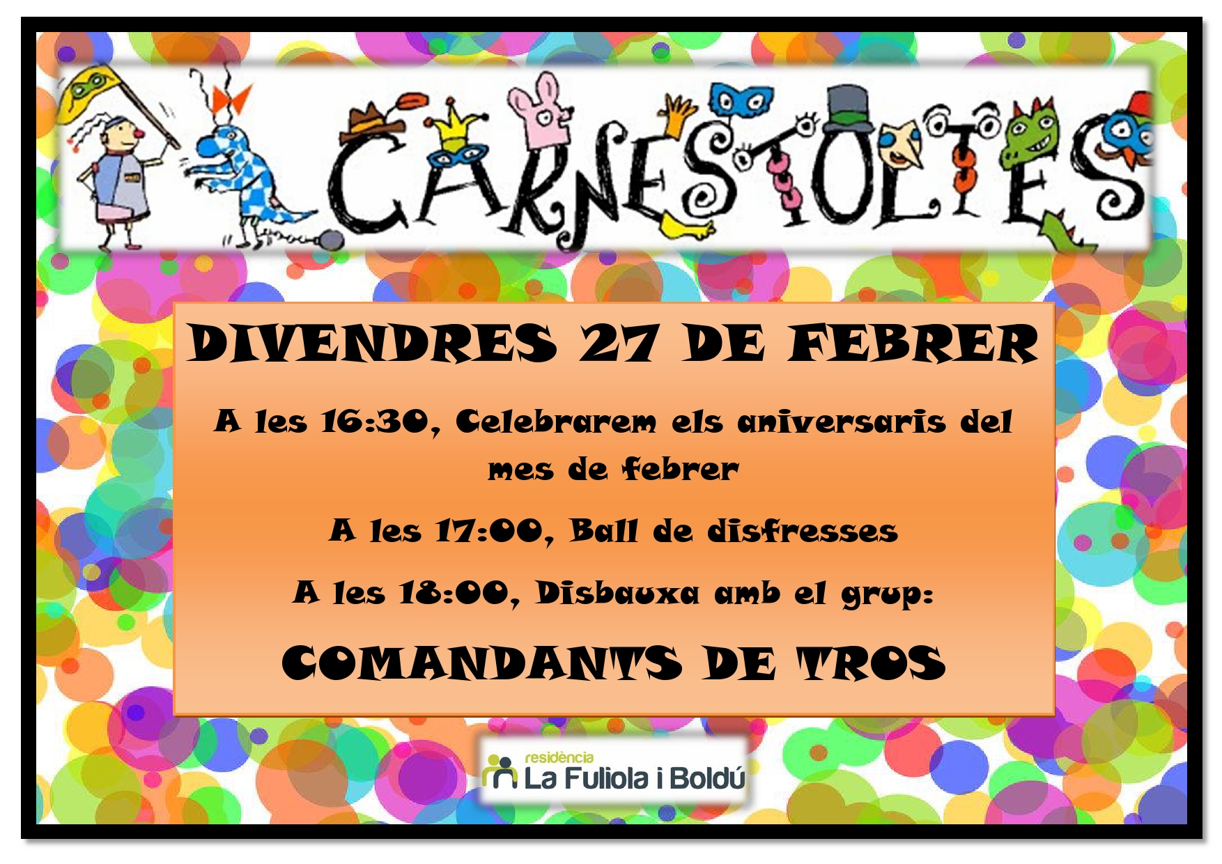 Ya llegó el Carnaval a la Residència La Fuliola i Boldú!!! El próximo viernes 27 de febrero, celebraremos los cumpleaños de los residentes nacidos este mes y el Carnaval. Convertiremos la residencia en un auténtico barco pirata y tendremos fiesta y desmadre asegurados con el grupo “Comandants de tros”.
