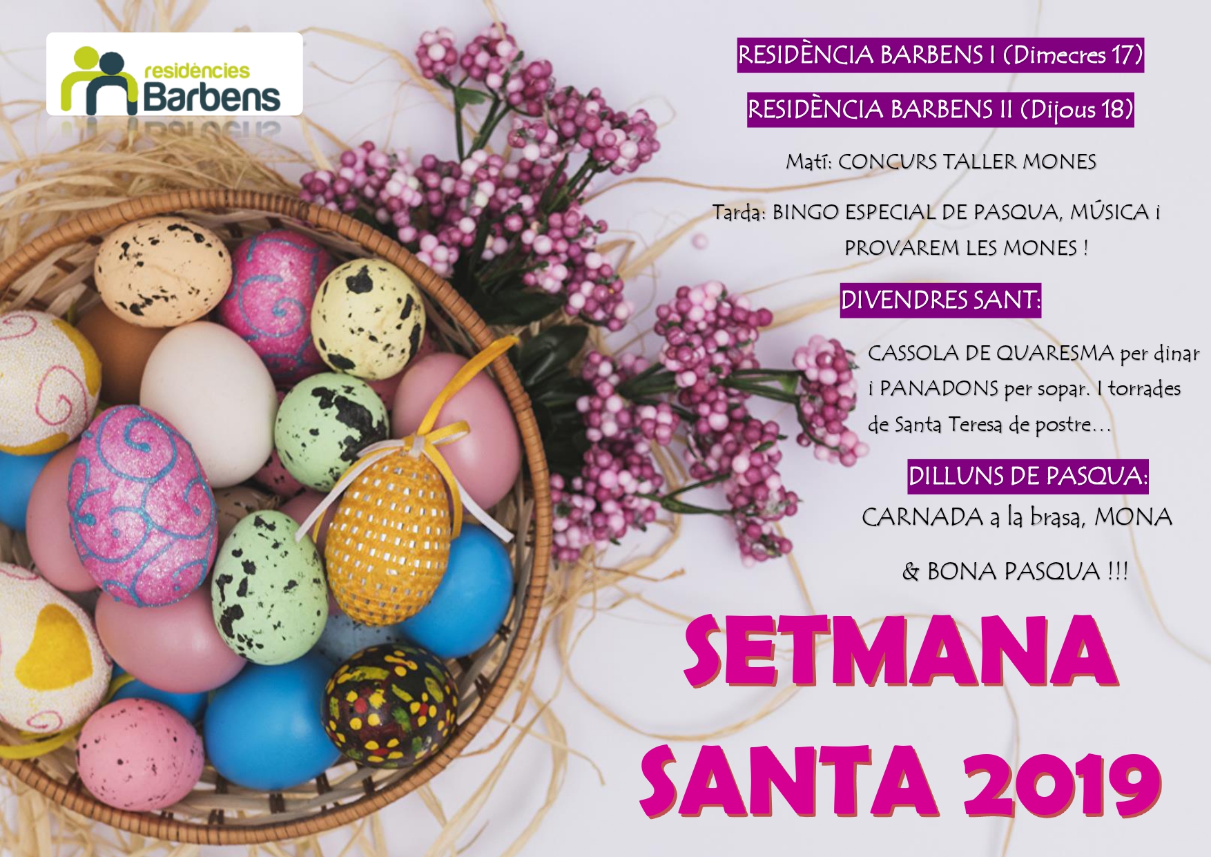 Ya tenemos aquí la Semana Santa y viene cargada de actividades: talleres de monas, bingo especial de Pascua, comidas típicas, buena música y, no puede faltar, el concurso de monas 2019. Aquí tenéis el programa de todas las actividades que se realizarán en las Residències Barbens. ¡¡¡ Os deseamos que paséis FELIZ PASCUA !!!